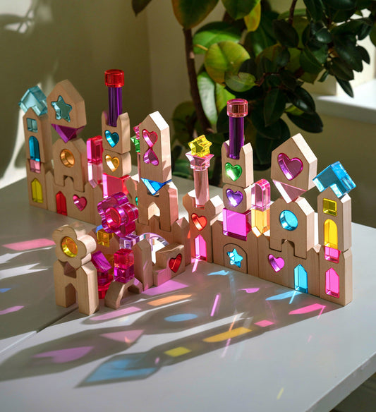 We absolutely loved the variety of shapes and colours in this set. Lot's of unique lucite pieces and the wooden shapes are great for building structures - from landscapes to castles. The arches work well with the majority of small cars too, which is very handy!