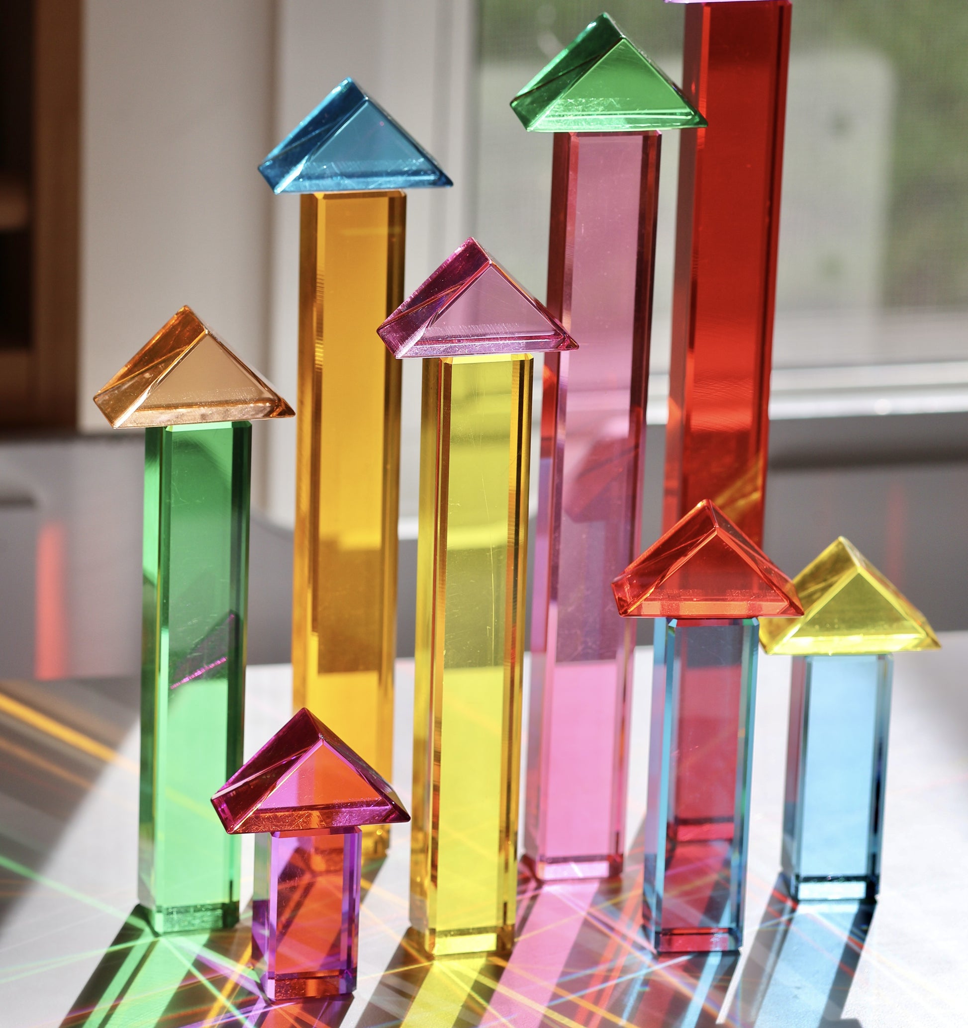 Four triangles in each of eight jewel-bright colours — red, pink, magenta, purple, yellow, orange, teal and blue — each one cut from the same premium lucite as our beloved Star of the Lucite Kingdom set. Nestle them into their engraved wooden tray and they create a rainbow grid so visually perfect you'll want to leave it on display forever.