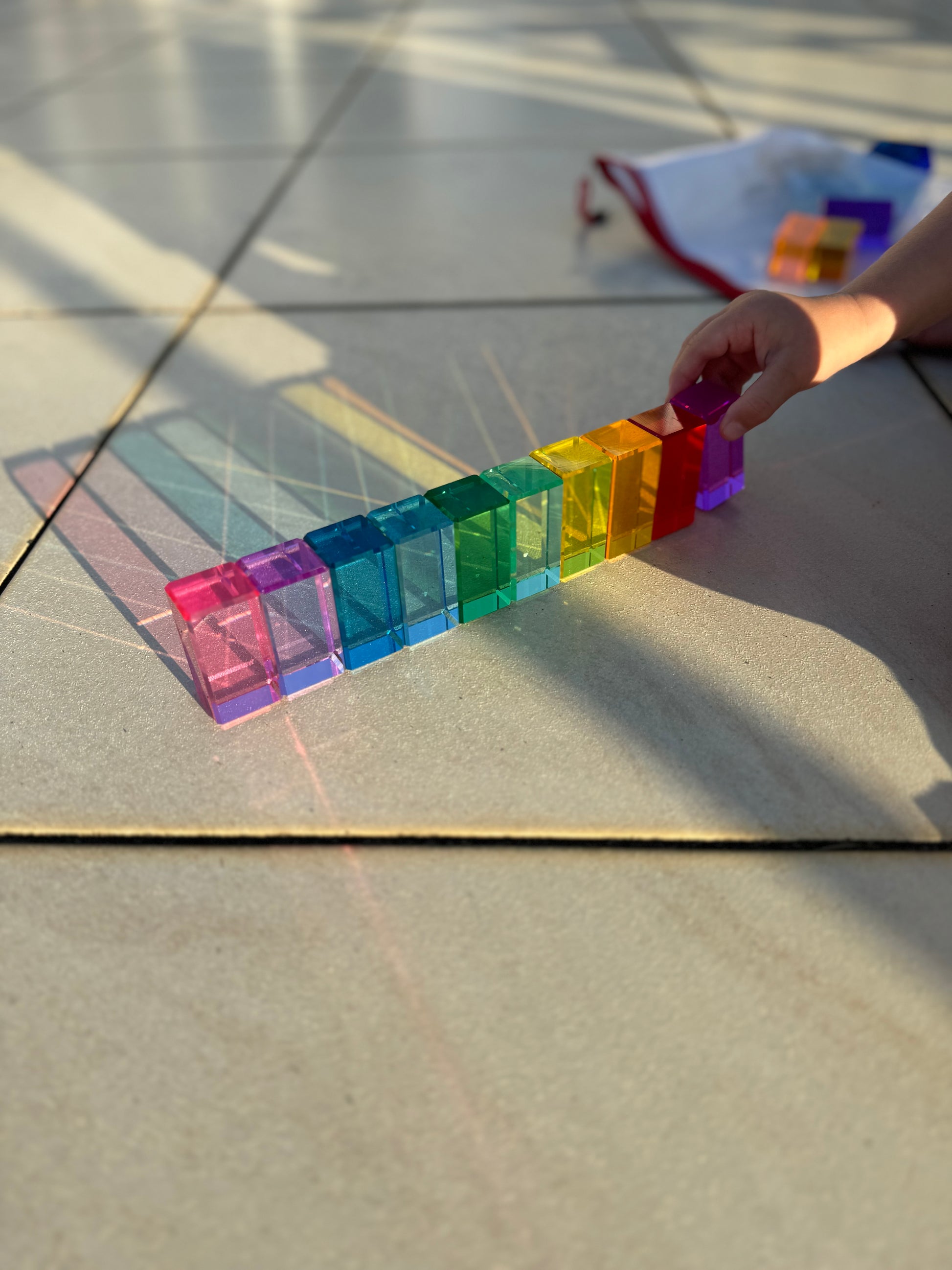 These lucite blocks come in the most vibrant colors. They are beautiful and make me wish we had more. I love how you can stack different colors together to teach mixing colors. They are fun, beautiful and functional. My daughter and I will be playing with these for a while.