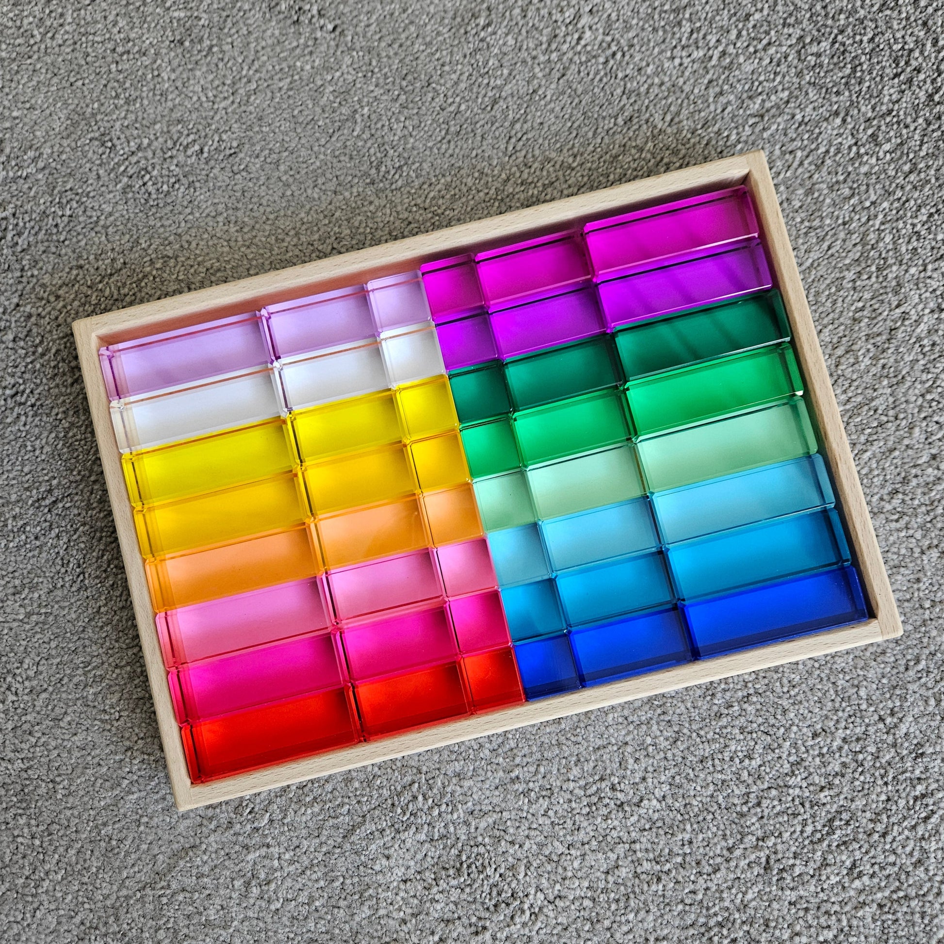 Unleash your child's creativity and learning potential with our premium set of 48 crystal clear Lucite cubes, cuboids (rectangle) and column (longer rectangle) blocks.