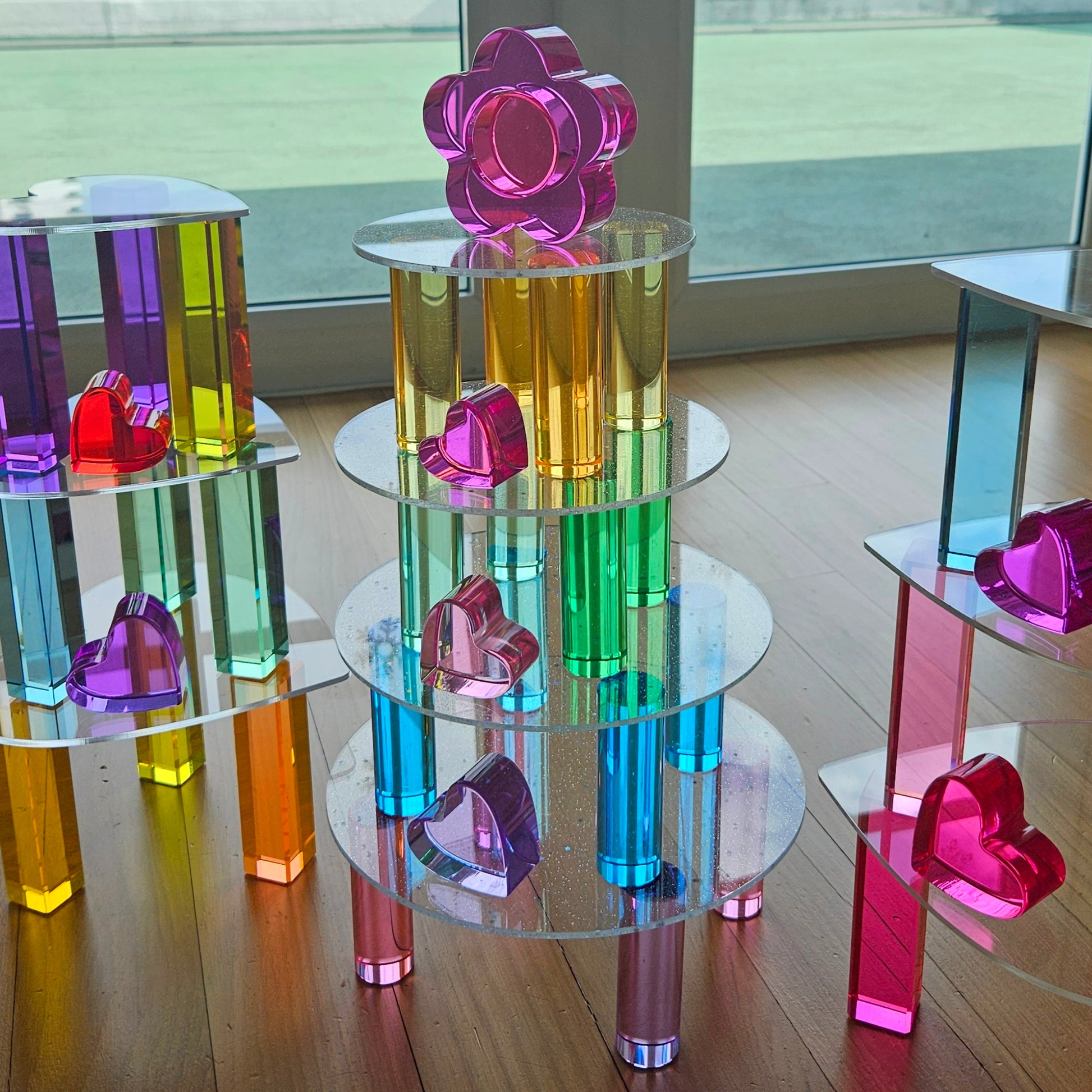 Fully compatible with all Playful Little Hearts open-ended sets, the Glitter Circular Platforms pair beautifully with our lucite pieces and wooden blocks for builds that shimmer, glow and catch the light from every angle.