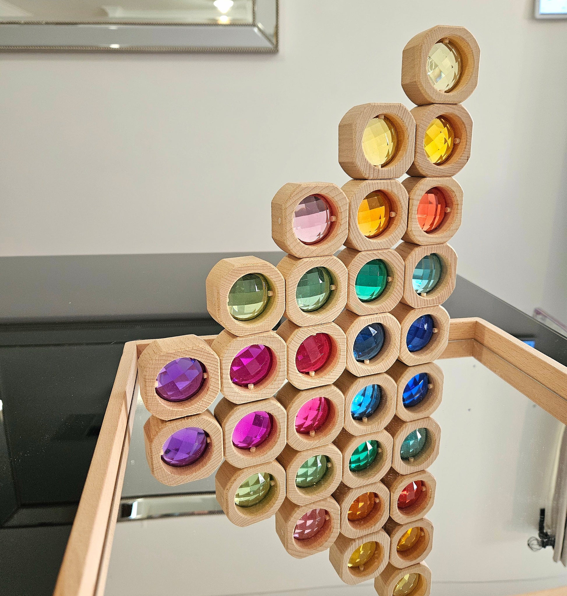 Unlock the magic of building and creativity with our newly designed enchanting Jewel Bitcoins (Rainbow)! These beautifully crafted, octagon-shaped wooden blocks feature a stunning jewel center, adding a touch of luxury and wonder to every creation.