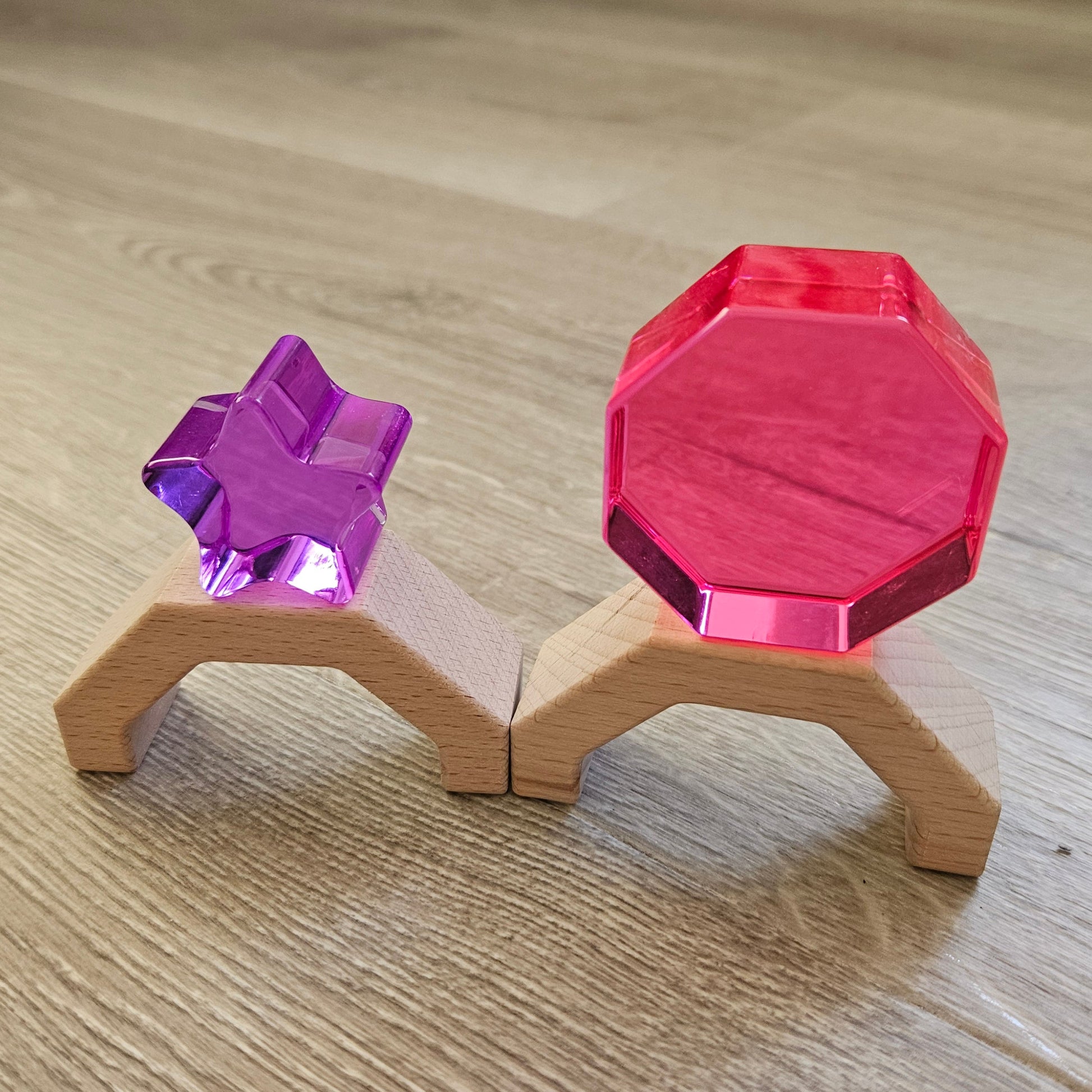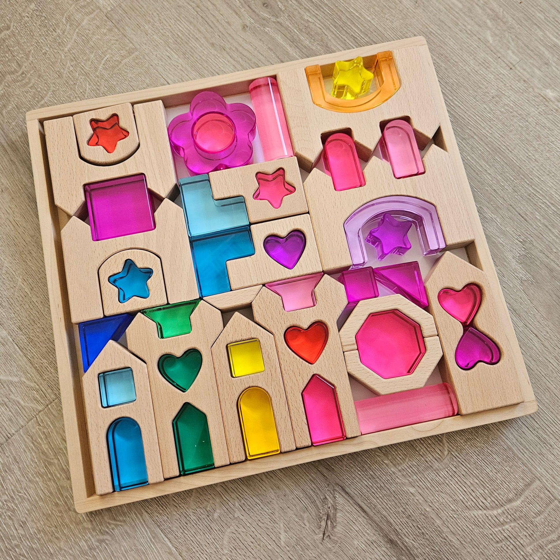 With 16 wooden pieces and 33 shimmering lucite pieces, this limited-edition collection invites children to build glowing castles, magical worlds, and creations that feel truly enchanted.