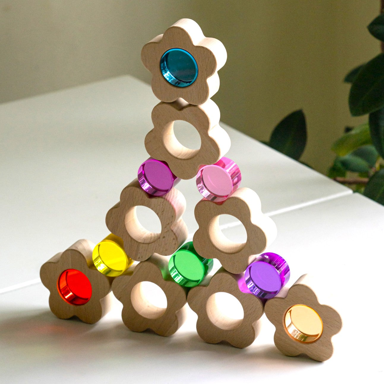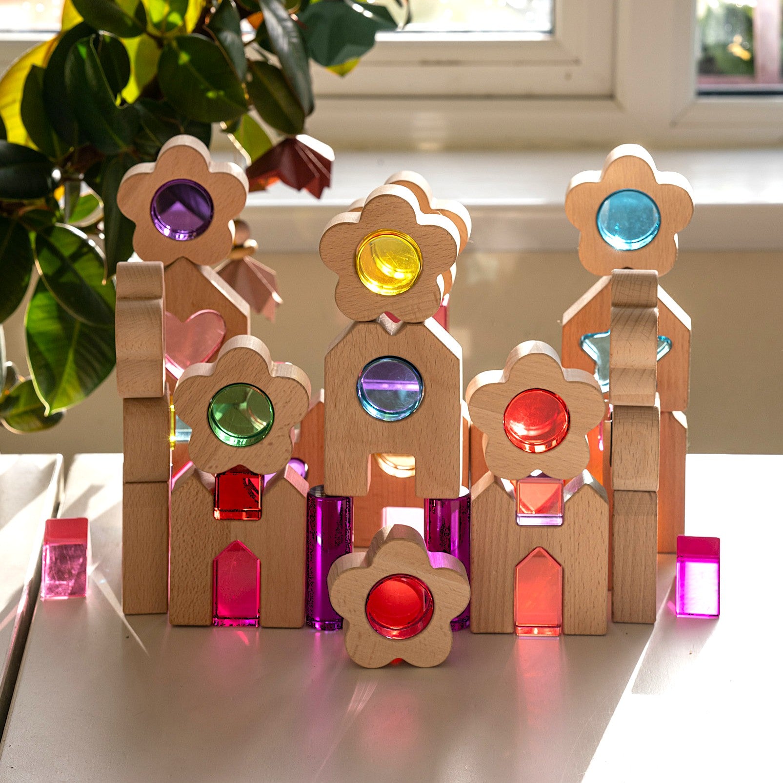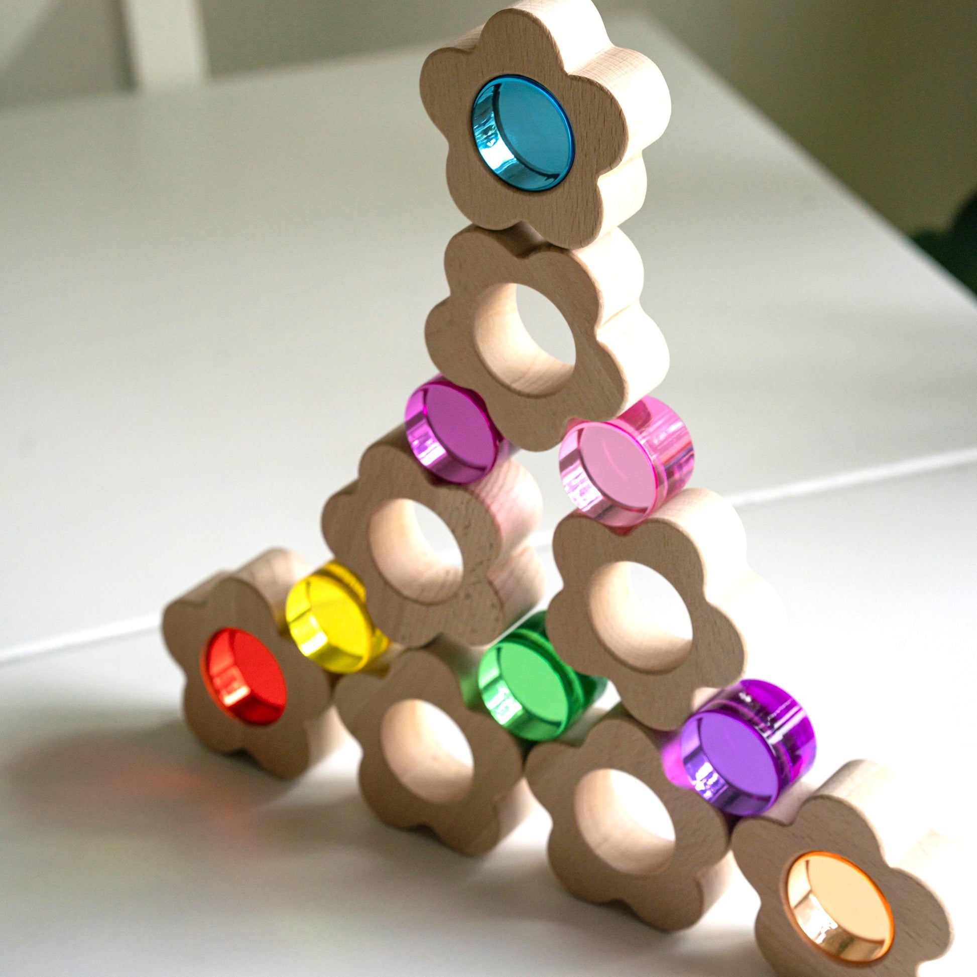 Eight solid wooden flowers, each one cradling a removable lucite round that glows with the most jewel-bright, light-catching colour you've ever seen in a children's toy. Red, orange, yellow, green, teal, pink, hot pink and purple, a full spectrum of wonder, each piece more captivating than the last.