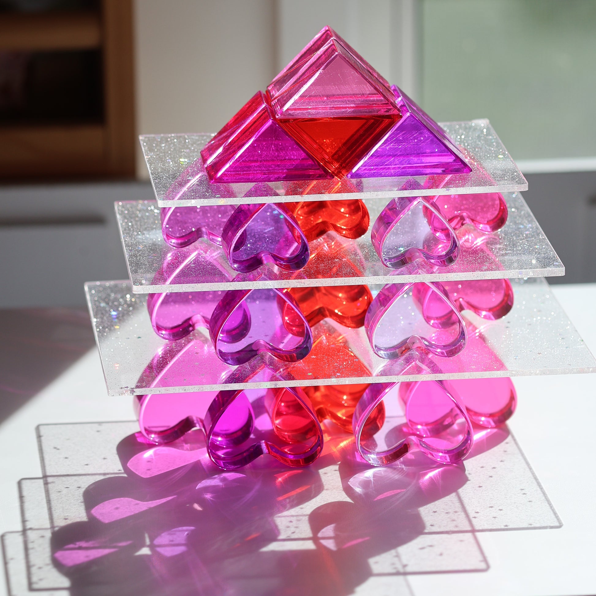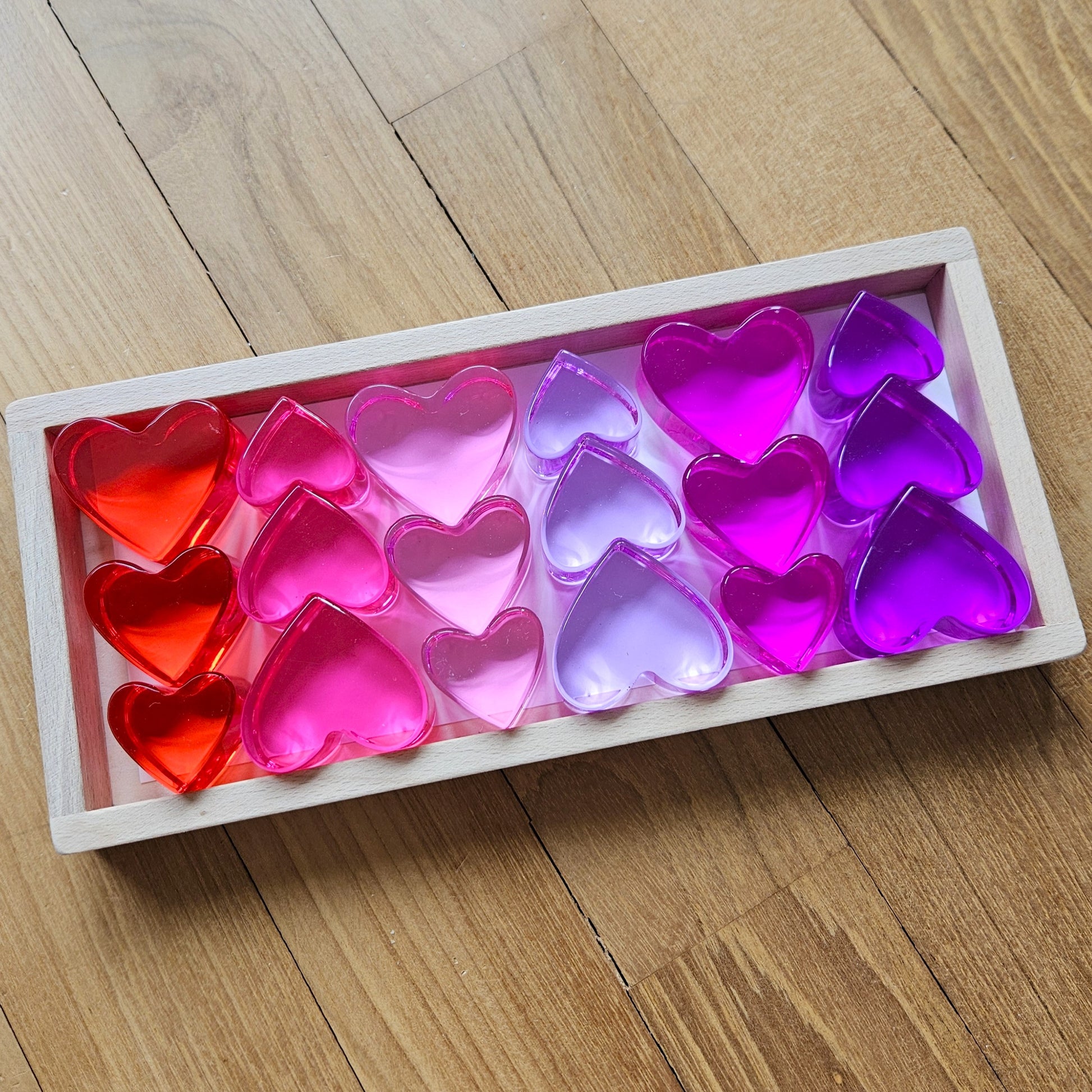 Eighteen lucite hearts. Three sizes. Six colours. A sweeping gradient of red, hot pink, blush pink, soft lilac, magenta and deep purple that looks like it was painted by hand. Nestle them together in their engraved wooden tray and they create one of the most visually stunning displays you'll ever see in a child's playroom.