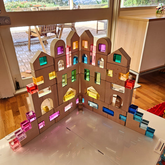 This is where it shines. My child (and I confess, I too) have used these to build so many different ideas: castles with battlements, secret doorways, multi-level fortresses, sometimes even merging with other wooden toys. They also pair nicely with the Lucite cubes that the company shows in other photos (though those are sold separately). The transparent blocks and wood together bring in light and shadow play which is great for sensory/tactile interest.